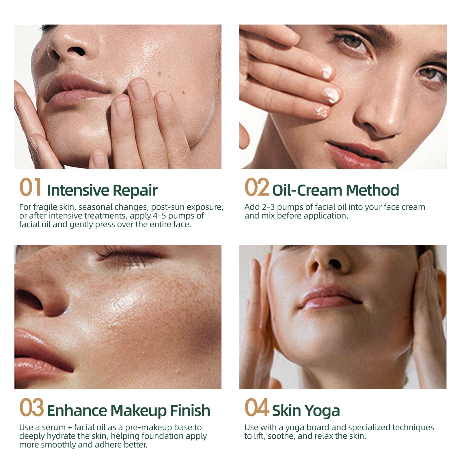 Silky serum-oil texture absorbs quickly without greasiness.
